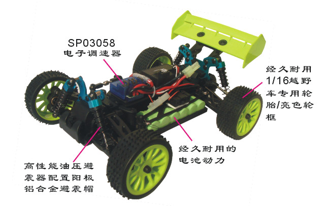 ●四轮驱动系统 ●高性能的差速系统配置高质量的齿轮装置,差速系统外壳配置5个装配螺丝方便用户维护和保养。 ●阳极处理高质量6061/T6二楼板/高质量底板。 ●坚固中传动轴性能强劲有力 ●高质量的越野车轮胎 ●高品质的避震器,阳极处理铝合金避震帽 ●前/后防撞板具备良好的防撞性能。 ●性能强劲RC380马达/高灵敏度电子调速器